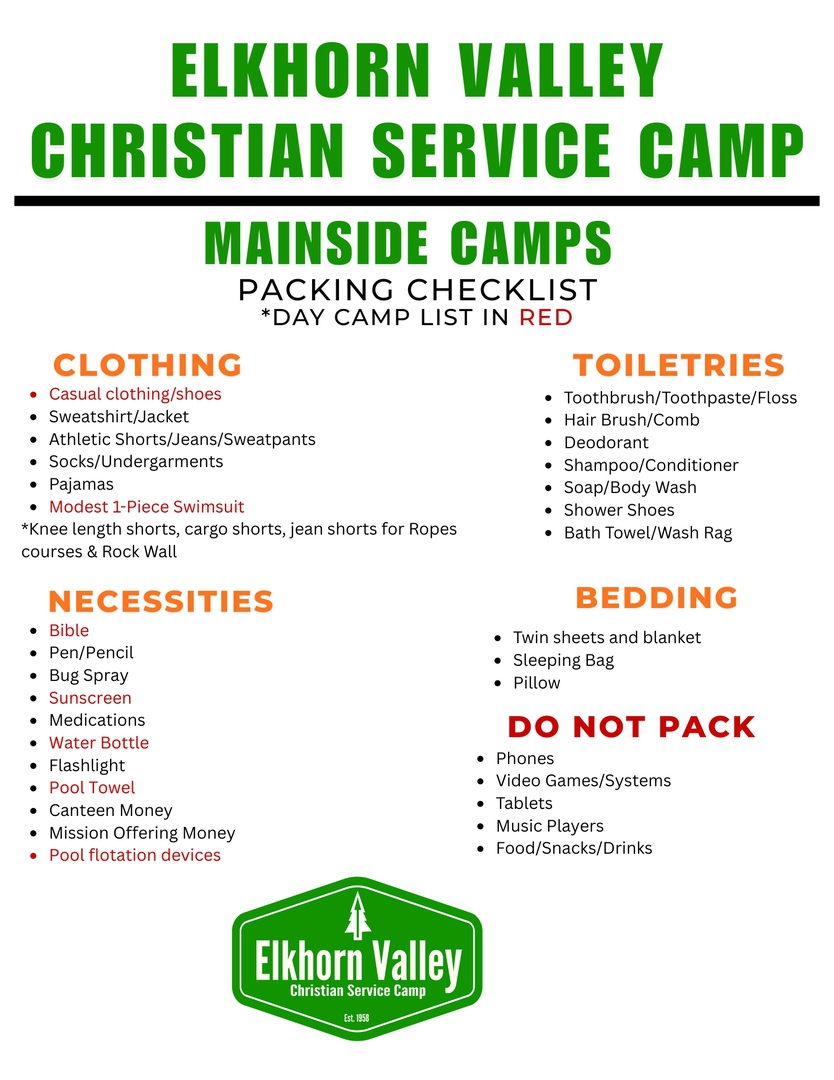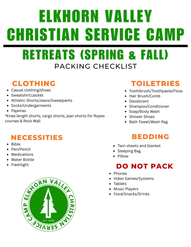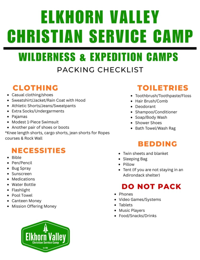Here is our packing list for our summer camps and retreats! If you have questions you can contact us: info@elkhornvalley.com or call: 740-768-2148