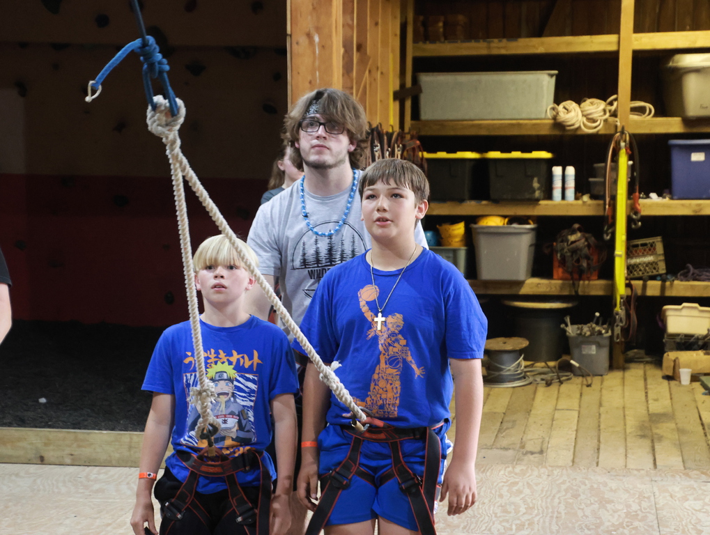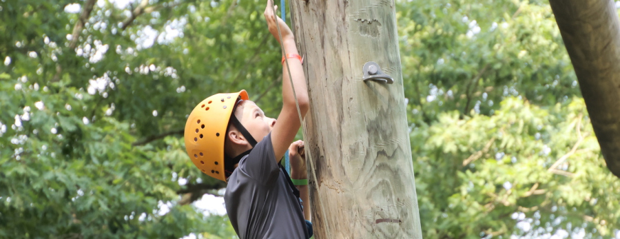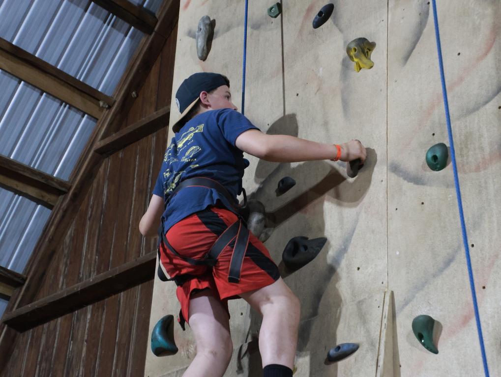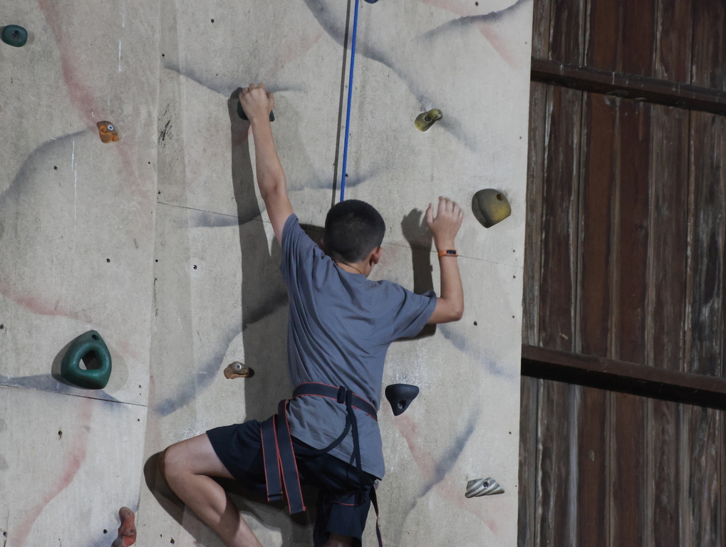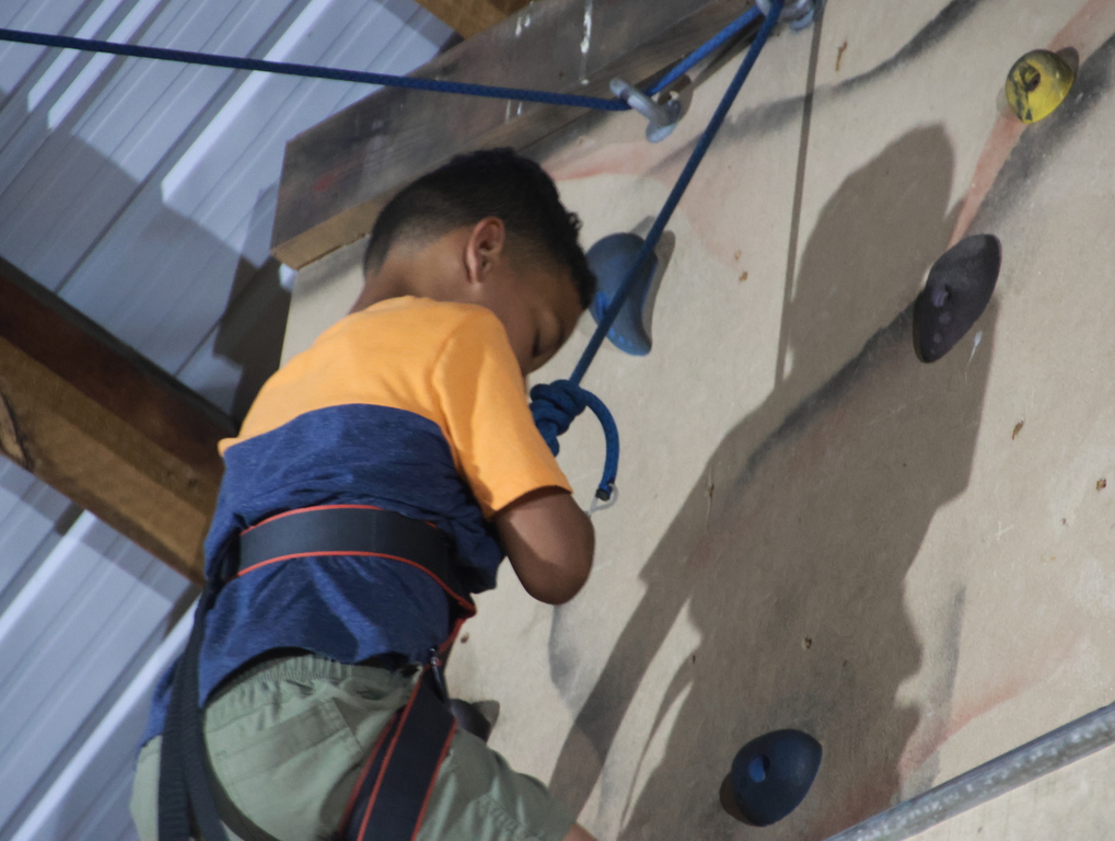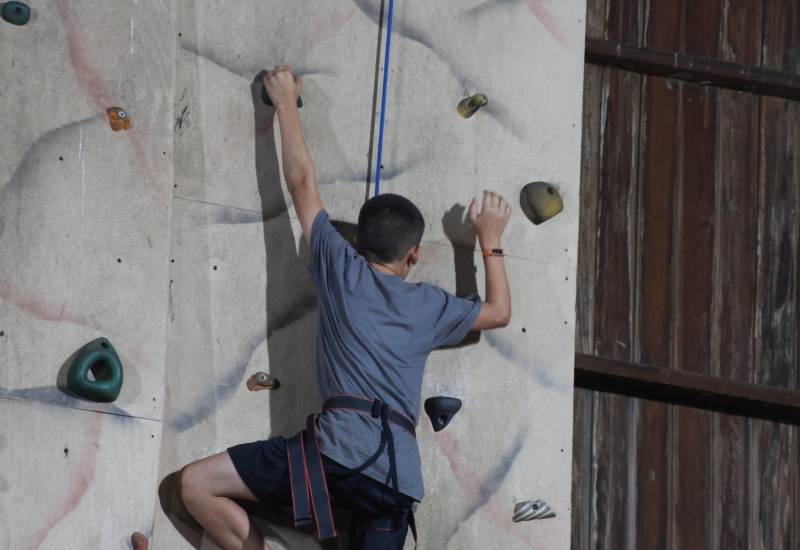 Our bouldering wall requires no harness or belay as it challenges the climber to scale the wall horizontally, while the rock wall challenges the climber to climb vertically with the support of their belay team.